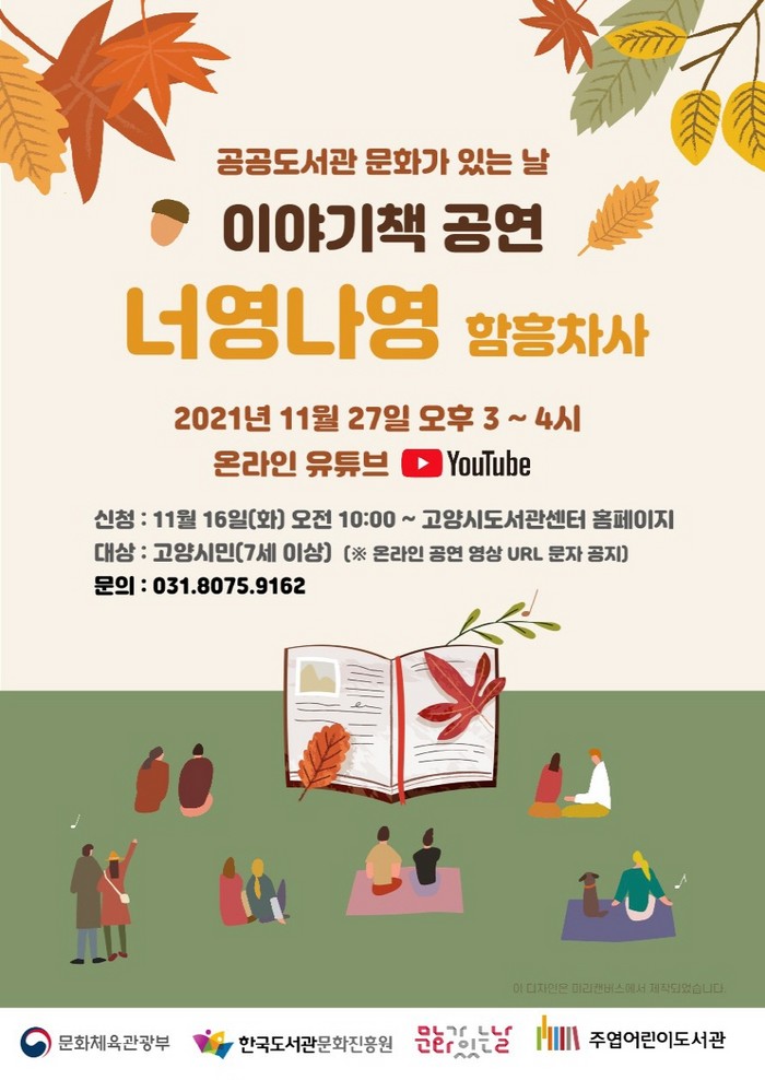 [부자동네타임즈 김인수기자] 고양시 주엽어린이도서관이 오는 11월 27일 이야기책 공연 너영나영을 온라인으로 진행한다.