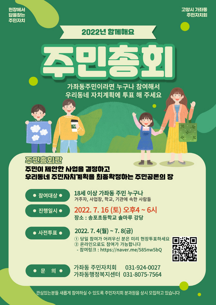 서호철 주민자치회장은 “주민총회는 주민생활과 밀접하게 연계된 생활문제 해결과 발전방안이 담긴 자치계획을 숙의하고 최종 투표를 통해 결정하는 동 단위 최고 의사결정기구이다. 올해 처음 개최되는 가좌동 주민총회에, 많은 주민의 적극적인 참여를 당부드린다”라고 말했다.