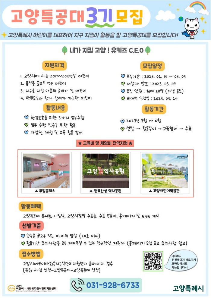 3기 신청은 센터 홈페이지 고양특공대 특화사업 신청 페이지에서 가능하며 3월 7일 선발된 어린이들에게 개별 통보 예정이다.