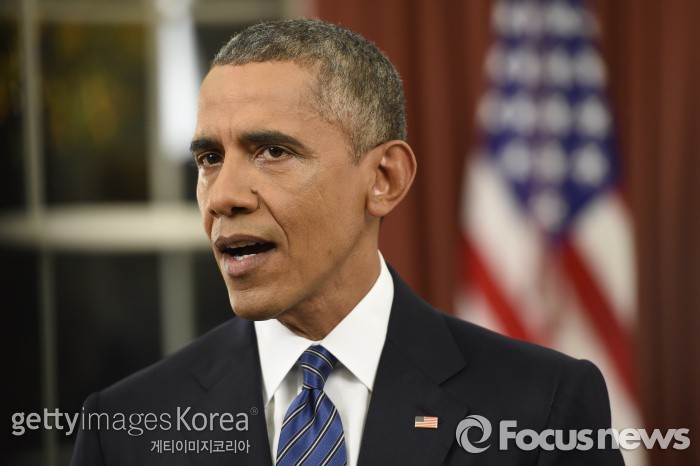 △ (워싱턴/미국=게티/포커스뉴스) 버락 오바마 미국 대통령은 6일 오후 8시(현지시간) 백악관 집무실에서 진행한 대국민 연설에서 "(샌버나디노 총기난사 사건은) 무고한 시민을 살해한 테러 행위"라고 목소리를 높이고 있다. ⓒ게티이미지/멀티비츠 photo@focus.kr