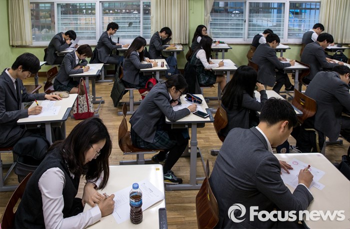 (서울=포커스뉴스) 13일 오전 서울 서초구 서초고등학교에서 고3 학생들이 정답표를 보며 전날 치른 대학수학능력시험 가채점을 하고 있다.