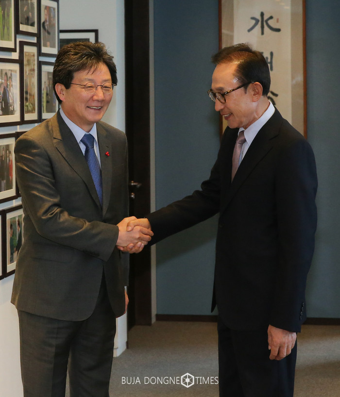 대선출마를 선언한 바른정당 유승민 의원이 31일 오전 서울 강남구 테헤란로 이명박 전 대통령의 사무실을 찾아 이 전 대통령과 악수를 하고 있다.