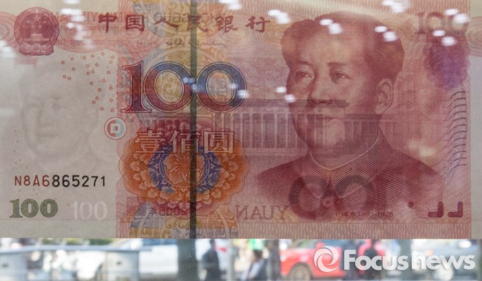 | △ 중국 위안화의 국제통화기금 특별인출권(SDR) 통화바스켓 편입이 결정된 1일 오전 서울 중구 KEB 하나은행 로비에 전시된 중국 100위안화 너머로 시민들이 지나가고 있다. <사진제공=포커스뉴스> |
