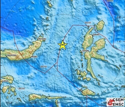 진앙은 북위 1.17도, 동경 126.28도이며 지진 발생 깊이는 35㎞라고 EMSC는 설명했다.