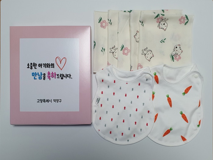 사업 대상은 덕양구 관내에 주소를 두고, 주소지 관할 동 행정복지센터에 출생신고를 한 2023년생 신생아이며, 출생신고 시 축하 기념 홍보물을 증정한다. 홍보물은 유기농 면 거즈 손수건 5매와 아기 턱받이 2매로 구성되어 있다.