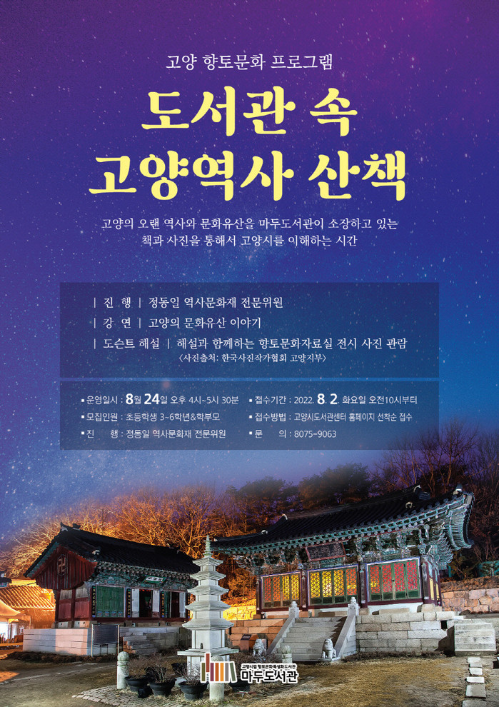 [부자동네타임즈 김인수기자] 고양특례시(시장 이동환) 마두도서관이 8월 24일(수) 도서관 강의실 및 향토문화자료실에서‘도서관 속 고양역사 산책’을 운영한다. 강의는 초등학교 3학년 이상의 고양시민이면 누구나 들을 수 있다.