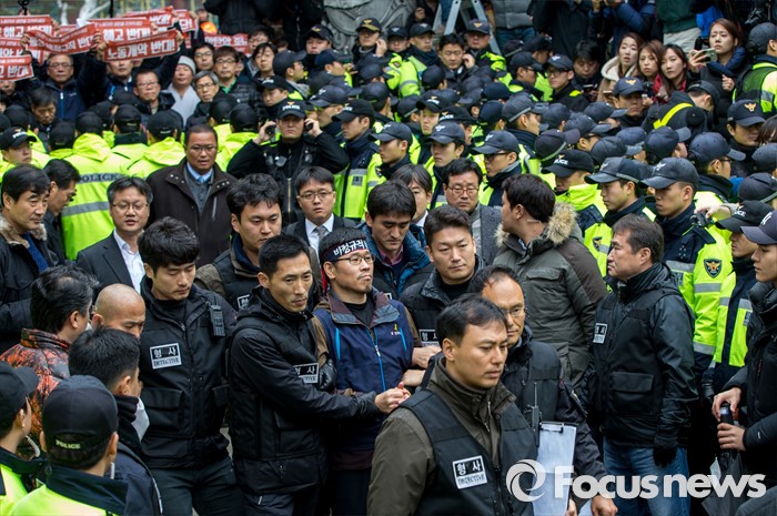 | △ 경찰들과 함께 조계사 나서는 한상균 위원장 |