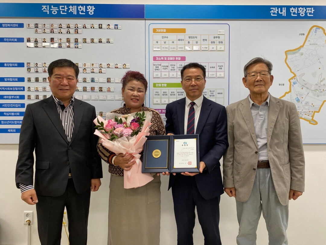 [부자동네타임즈 = 김인수 기자] 고양특례시 삼송1동 행정복지센터는 지난 17일 ‘제27회 노인의 날’을 기념하여 노인복지에 기여한 공로로 손연숙(여·55)씨에게 경기도지사 표창장을 수여했다.