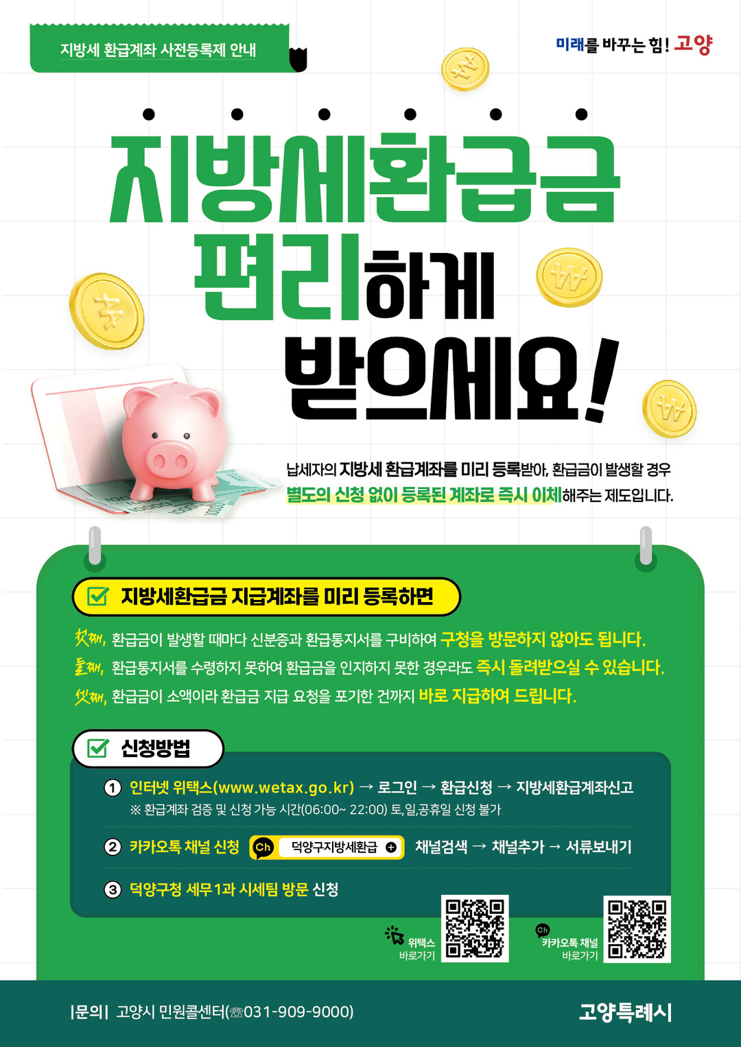 [부자동네타임즈 = 김인수 기자] 고양특례시 덕양구(구청장 한창익)는 지방세 환급금이 발생할 때마다 환급계좌를 신청해야 하는 번거로움을 덜기 위해 지방세 환급계좌 사전등록 서비스를 시행 중이라고 밝혔다.