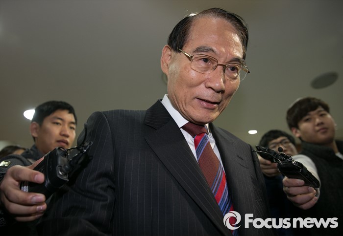 | △ 새누리당에 '팩스입당'한 김만복 전 국정원장이 지난달 20일 오전 서울 여의도 새누리당사에서 열린 중앙윤리위원회 전체회의에 참석하며 취재진의 질문에 답하고 있다. <사진제공=포커스뉴스> |