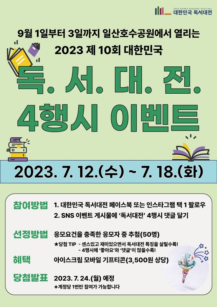 시는 독서대전의 특징을 잘 살린 4행시 중 총 50명을 선정하여 모바일 상품권을 증정할 예정이다. 이벤트 당첨자는 7월 24일 독서대전 공식 홈페이지와 인스타그램, 페이스북에 공지될 예정이다.