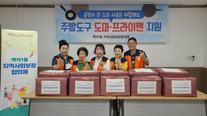 곰팡이가 슬거나 훼손된 도마 등 주방도구는 세균이 번식하기 쉽다. 여름철 식중독 위험이 커지고 있는 상황에서 백석1동 지역사회보장협의체는 저소득층 건강지킴이 특화사업으로 한부모가정 20가구에 도마, 프라이팬 등 주방도구 교체 지원을 실시했다.
