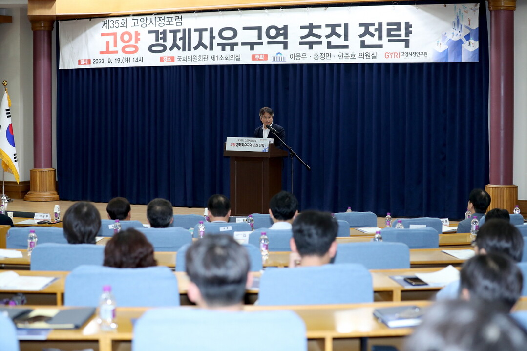 제35회 고양시정포럼은 고양특례시의 핵심 정책인 ‘고양 경제자유구역 지정’과 ‘글로벌 자족도시 도약’을 논의하기 위해 마련했다. 고양특례시 고양시정연구원, 이용우, 홍정민, 한준호 국회의원 의원실 공동주최로 19일 국회의원회관 제1소회의실에서 열렸다.