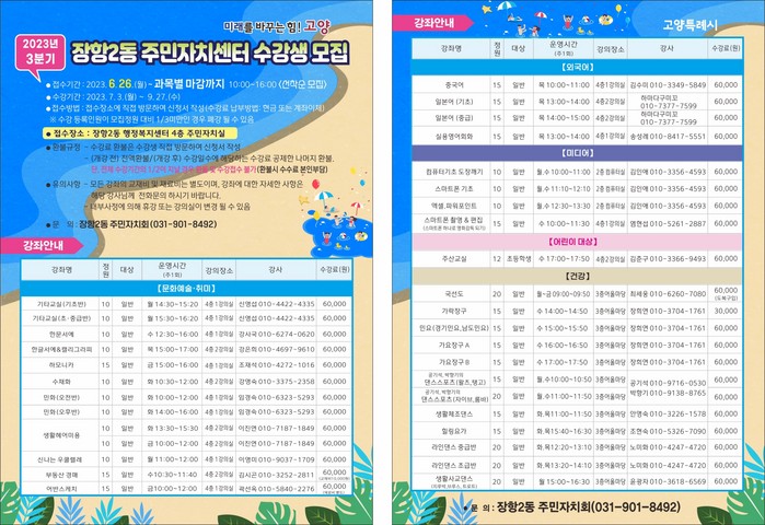 [부자동네타임즈 김인수기자] 고양특례시 장항2동 주민자치회는 오는 6월 26일부터 30일까지 2023년 3분기 문화강좌 프로그램 수강생을 모집한다.