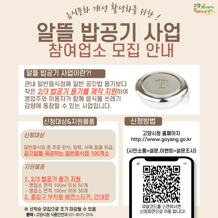 신청 대상은 고양시에서 일반음식점을 운영하며 주로 한식, 탕류, 식육 등을 취급, 공깃밥을 제공하는 영업형태로 해당 사업을 적극적으로 실천할 의지가 있는 업소이다. 단, 공깃밥을 취급하지 않는 음식점 등은 제외된다.