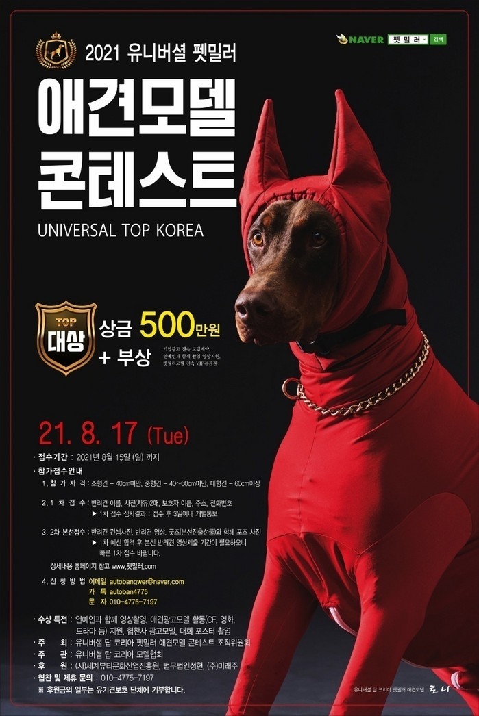 [부자동네타임즈 김인수기자] 오는 8월 17일 유니버셜 탑 코리아에서 주최하는 ‘펫밀러’ 애견모델 콘테스트가 개최된다.