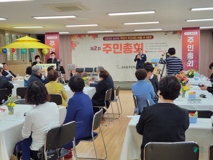 지난 3월 제1회 송포동 주민총회 개최에 이어 두 번째 개최된 이번 주민총회는 2023년도 자치사업을 추진을 위한 자치계획을 확정하고 주민들의 의견을 듣는 자리다. 송포동 주민자치회는 총회 개최 전 지역주민을 대상으로 사전투표를 진행해 302명(오프라인 197명, 온라인105명)이 사전에 참여했다.