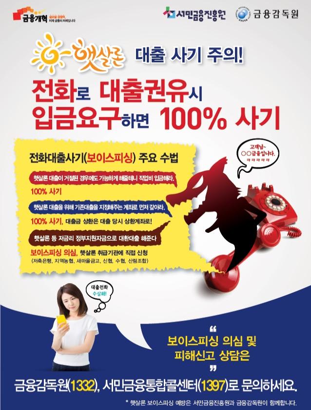 진흥원은 홍보활동을 위해 햇살론 취급접점인 은행창구와 현금자동입출금기(ATM), 편의점 등에 햇살론 사칭 대출사기 주의 홍보 포스터를 배포하고 은행 홈페이지에 경고문을 게재한다.