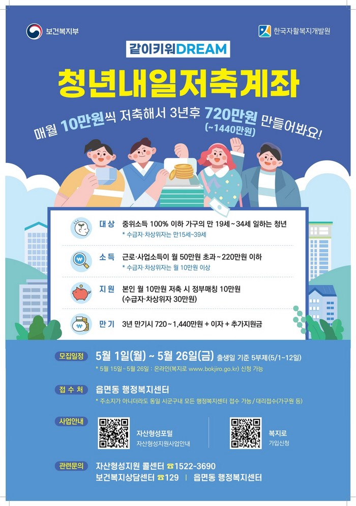 [부자동네타임즈 김인수기자] 고양특례시(시장 이동환)가 5월 1일부터 26일까지 저소득 청년의 경제적 자립을 지원하기 위해 청년내일저축계좌 신규 가입자를 모집한다.
