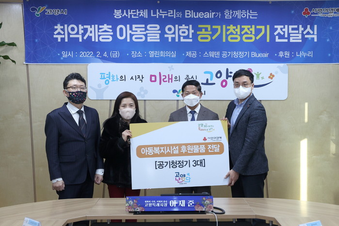 [부자동네타임즈 김인수기자] 고양시는 지난 2월 4일 민간 봉사단체 ‘나누리’와 스웨덴 공기청정기 브랜드 ‘블루에어(Blueair)’에서 공기청정기를 기탁받아 취약계층 아동시설에 전달했다고 밝혔다.