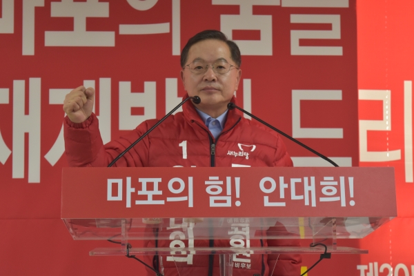 "다시 한번 외칩니다 마포에 살길 잘했다! 저 안대희가 마포의 꿈을 재개발하겠습니다."