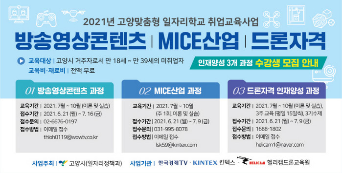 올해는 시에서 주력하는 방송영상콘텐츠·마이스·드론산업 분야 전문교육기관(한국경제TV, 킨텍스, 헬리캠드론교육원)과 연계해 교육을 실시하고 일자리도 연계한다.