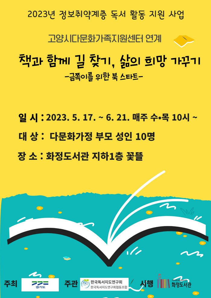 [부자동네타임즈 김인수기자] 고양특례시(시장 이동환) 화정도서관이 경기도가 주최하고, 한국독서지도연구회협동조합이 주관하는 ‘2023년 정보취약계층 독서 활동 지원’ 공모사업에 선정됐다.