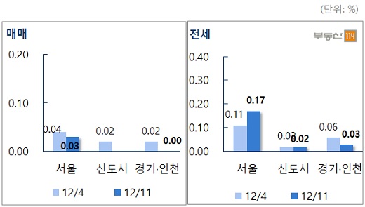 또 서울 아파트 매매가격 상승률은 0.03%, 신도시는 -0.01%, 경기·인천은 0.00%를 각각 나타냈다.