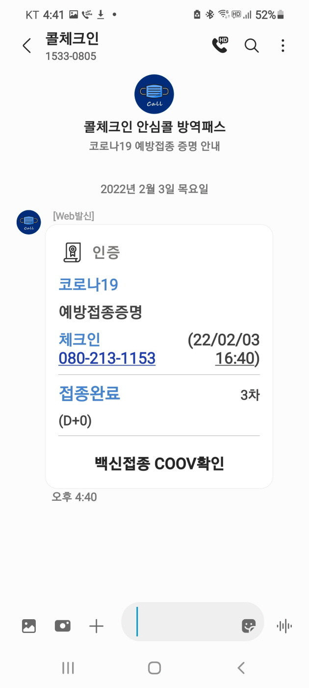 [사진설명] RCS를 적용한 ‘안심콜 방역패스’ 접종정보 문자 안내.