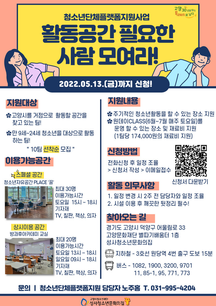 고양시에서 관내 청소년대상으로 공간이 필요한 청소년단체나 청소년동아리는 누구나 신청할 수 있으며 5월 13일까지 전화로 신청하면 된다. 선착순 10팀에 한해 지원되며 성사문화의집 이용청소년을 대상으로 프로그램을 제공할 경우 프로그램에 필요한 소정의 재료비와 테이블, 의자, TV 등을 지원할 예정이다.