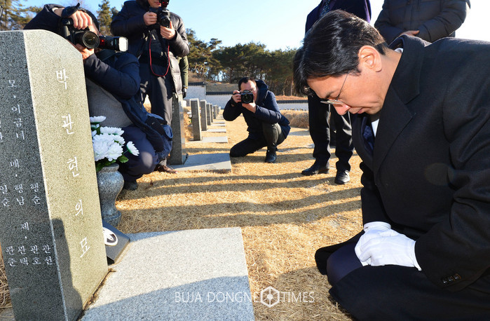 더불어민주당 대권 주자인 안희정 충남지사가 12일 오전 광주 북구 운정동 국립5·18민주묘지 박관현 열사의 묘역에서 무릎을 꿇고 참배하고 있다. 2017.02.12.