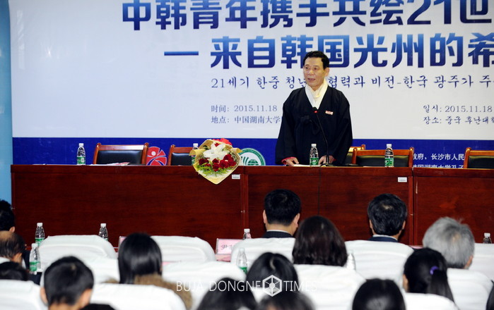 [광주=부자동네타임즈 손권일 기자]윤장현 광주광역시장이 지난 18일 오전 중국 후난대로부터 명예교수로 위촉된데 이어 학계 원로 및 학생 등 300여 명을 대상으로 '21세 한·중 청년의 고동비전'이라는 주제의 특강을 했다.