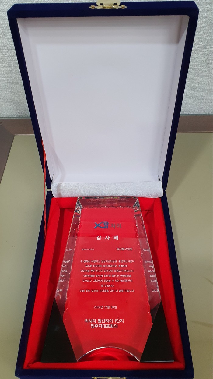 [부자동네타임즈 김인수기자] 방경돈 일산동구청장은 작년 9월 환경개선사업을 완료한 식사동 상상어린이공원이 우수한 디자인으로 주민들을 만족 시켜 위시티일산자이1단지아파트 입주자대표회의로부터 감사패를 받았다.