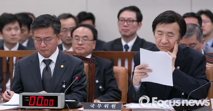 | △ 25일 오전 서울 여의도 국회에서 열린 외교통일위원회 전체회의에 참석한 윤병세(오른쪽) 외교부 장관과 홍용표 통일부 장관이 자료를 살펴보고 있다. <사진제공=포커스뉴스> |
