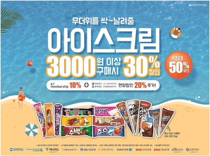바형,콘형 등 같은 타입의 아이스크림에 한해1+1, 2+1 할인을 진행했던 기존행사와 달리,아이스크림 타입에 상관없이 3,000원 이상 구매 시 30% 할인 혜택을 받을 수 있도록 했다.