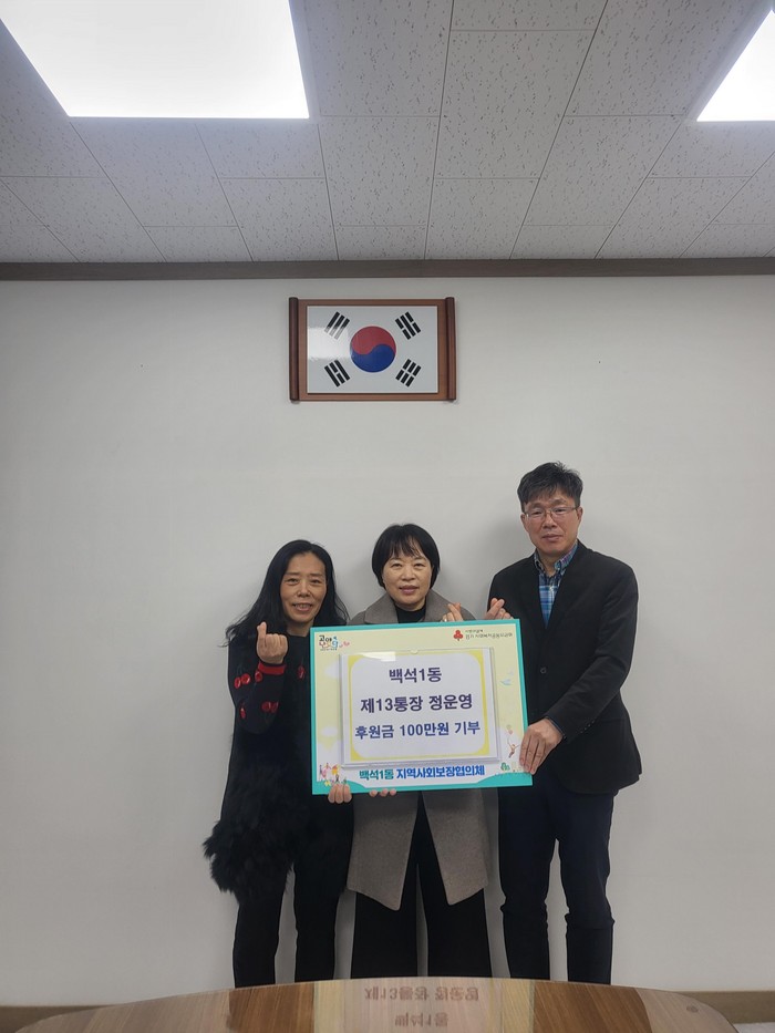 지난 4년간 백석1동 통장으로 활동해오며 항시 지역에 대한 깊은 관심을 보이고 솔선수범하는 자세로 주민화합 및 마을발전에 기여하였으며 임기를 마치며 기부에도 동참한 것이다.
