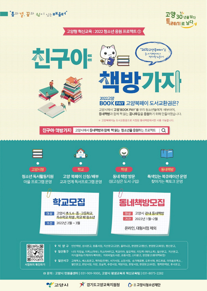 친구야! 책방가자~는 도서교환권을 배부해 청소년이 동네 책방에서 참고서가 아닌 다양한 분야의 책을 직접 고르며 책과 가까워지고 독서에 흥미를 가질 수 있도록 지원한다. 올해는 40개 지역 서점과 160여개 학교가 참여할 예정이다.