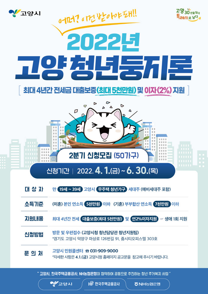 [부자동네타임즈 김인수기자] 고양시가 4월 1일부터 ‘고양 청년둥지론’의 2분기 신청자 50가구를 모집한다.