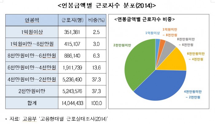 2014년도 연봉금액별 근로자수 분포를 살펴보면, 연봉이 ‘1억원이상’인 근로자는 35만1381명(2.5%), ‘8000만~1억원’은 42만5107명(3.0%), ‘6000만∼8000만원’은 88만6140명(6.3%), ‘4000만∼6000만원’은 191만1739명(13.6%), ‘2000만∼4000만원 ’은 523만6490명(37.3%) ‘2000만원 미만’은 524만3576명(37.3%)으로 분석됐다.