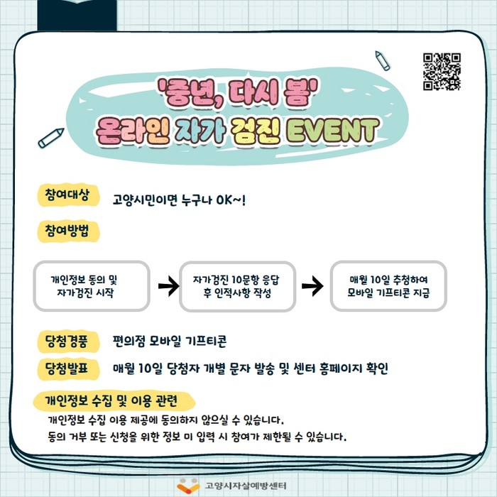 ‘중년, 다시 봄’이벤트는 QR코드로 접속하면 이용할 수 있다. 고양시자살예방센터 챗봇을 통해 우울 자가검진을 받고 검사 결과를 바로 확인할 수 있다. 상담을 희망하는 경우 센터로 연계되어 무료로 정신건강 상담도 받을 수 있다.