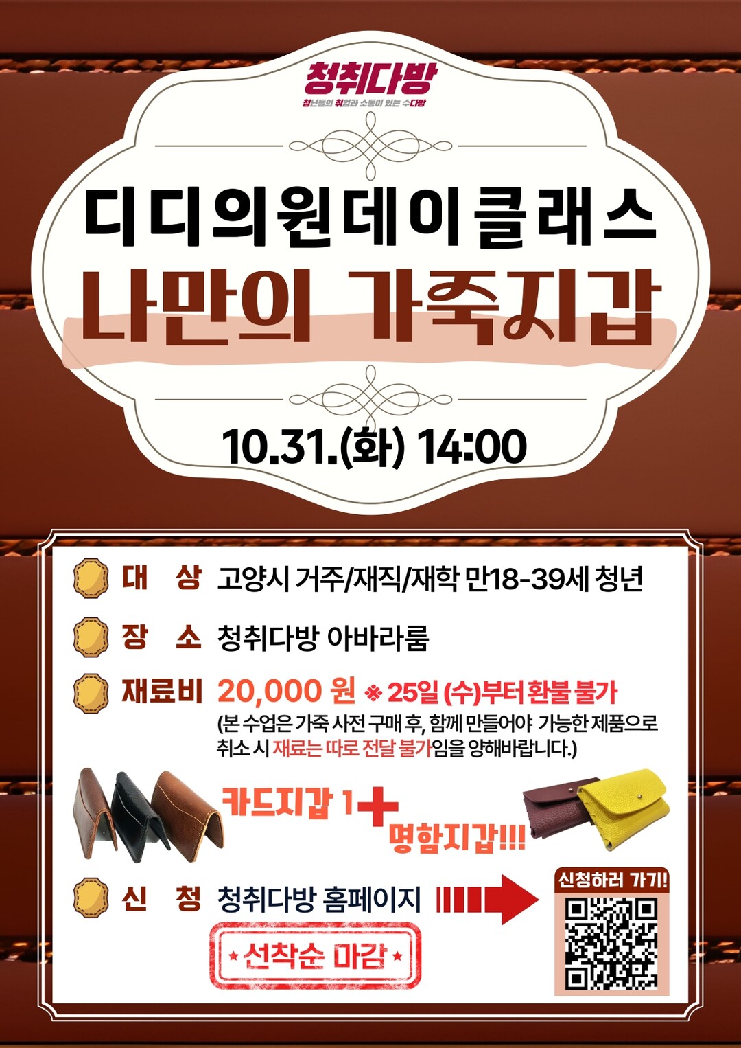 [부자동네타임즈 = 김인수 기자] 청취다방이 가을을 맞아 10월 31일 ‘디디의 원데이 클래스 - 나만의 가죽지갑 만들기’를 운영한다. 현재 시는 참가자를 선착순 모집하고 있다.