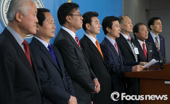 △ 7일 오전 서울 여의도 국회 정론관에서 이대의 민주당(구 새정치민주연합) 전 경기도당 위원장을 비롯한 전국위원장 모임이 기자회견을 열고 현재 추진되고 있는 박주선 무소속 의원, 천정배 무소속 의원, 박준영 전 전남도지사 등 모든 세력이 하나로 뭉치는 통합신당 창당을 촉구하고 있다. <사진제공=포커스뉴스>