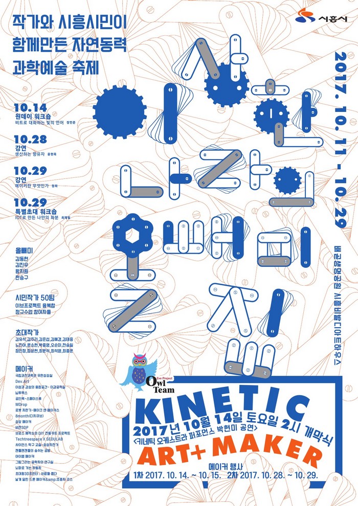 올빼미는 시흥 레지던시에 입주한 4명의 작가[김동현, 김진우, 왕지원, 한승구]를 의미한다. 올빼미 팀은 김동현 예술감독을 중심으로 융·복합 교육을 통해 40팀의 시민예술가를 양성하였고, 시흥 곳곳에 숨어있는 메이커를 발굴하였다. 이번 전시에는 그간 발굴한 메이커들과 협업하여 새롭게 제작한 다양한 키네틱, 미디어 예술을 시흥시민에게 선보인다.