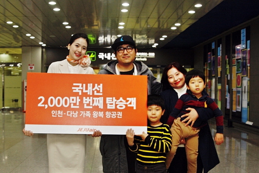 | △ 23일 오전 제주항공의 2000만번째 국내선 탑승객인 유정미씨(36, 수원시 영통구)가족이 인천~다낭 4인 가족항공권을 받고 기념촬영을 하고 있다. <사진제공=제주항공> |
