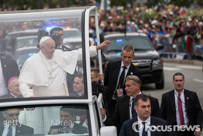 △ (필라델피아/미국=게티/포커스뉴스) 지난 9월27일(현지시간) 미국 필라델피아를 방문한 프란치스코 교황이 야외미사를 집전하러 이동하는 중 그를 보려고 모여든 수천명의 인파에게 손을 흔들며 인사하고 있다. ⓒ게티이미지/멀티비츠 photo@focus.kr