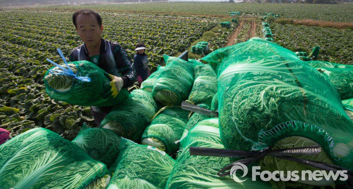 (청주=포커스뉴스) 김장철을 앞두고 5일 오전 충북 청주시 오송읍 오송리 들녘에서 농민들이 배추를 수확하고 있다.