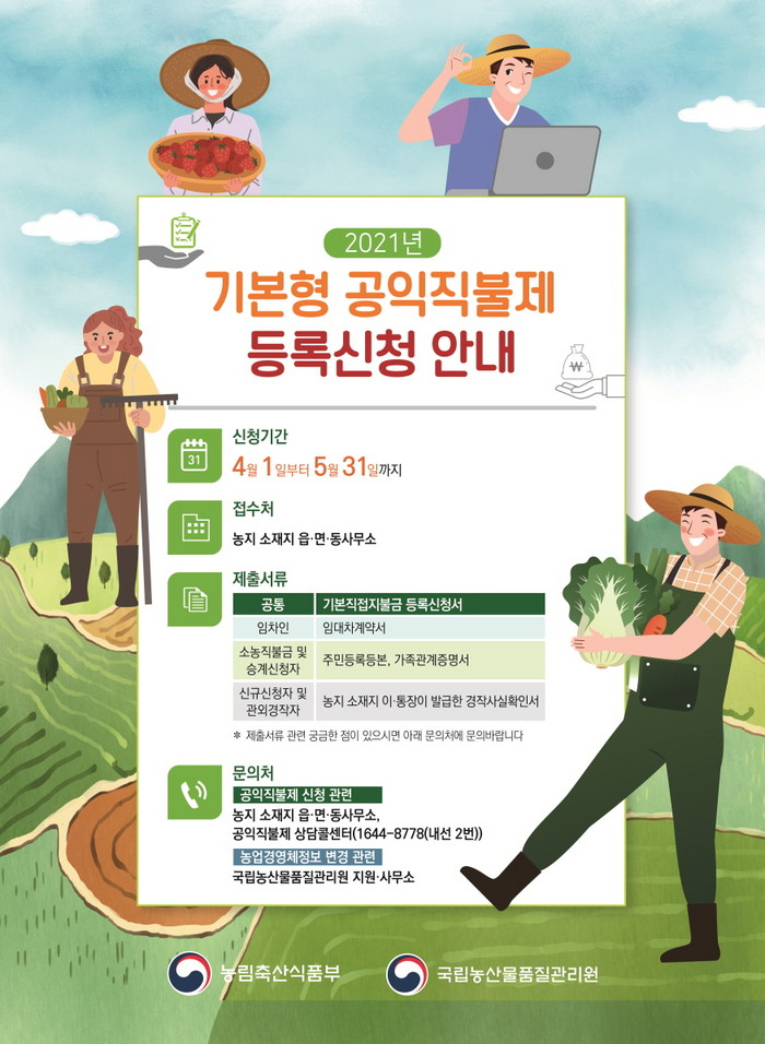 공익직불제는 농업을 통해 재해방지·경관보전 등에 기여하고 있는 농업인이 안정적으로 소득을 얻을 수 있도록 정부에서 보조금을 지원하는 제도다. 지난해 쌀·밭 직불제 등 6개 직불제를 개편해 ‘기본형’과 ‘선택형’으로 통합했으며, 기본형 공익직불제 신청을 5월 말까지 받고 있다. 기본형 공익직불제는 소농직불금과 면적직불금으로 나뉜다.