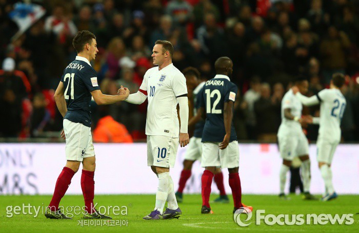| △ <런던/영국=게티/포커스뉴스> 웨인 루니가 18일 새벽(한국시간) 홈에서 열린 프랑스와의 평가전 종료 이후 프랑스 수비수 로랑 코시엘니와 악수를 나누고 있다. (C)게티이미지/멀티비츠 |