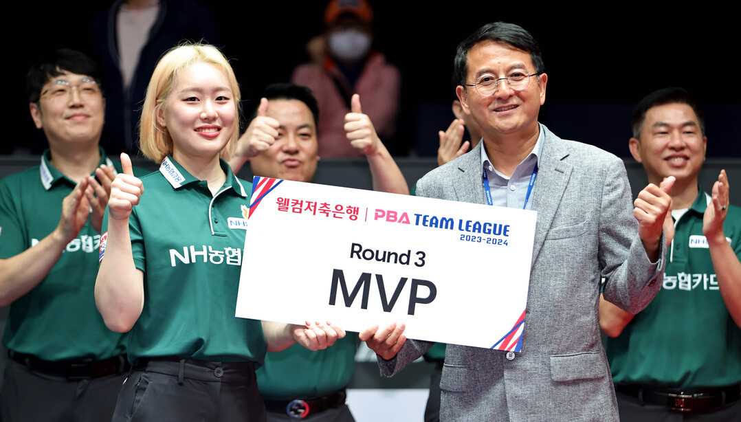 [부자동네타임즈 = 김인수 기자] 지난 22일 경기도 고양시 ‘고양 킨텍스 PBA 스타디움’에서 열린 ‘웰컴저축은행 PBA 팀리그 2023-2024’ 3라운드 최종일 경기서 NH농협카드는 크라운해태를 세트스코어 4:0으로 물리치고 8연승에 성공, PBA 팀리그 최다연승 기록과 동시에 3라운드 전승 우승을 차지했다. 3라운드 MVP(상금 100만원)는 팀내 최다승(12승3패)을 올린 ‘퍼펙트걸’ 김보미가 받았다.