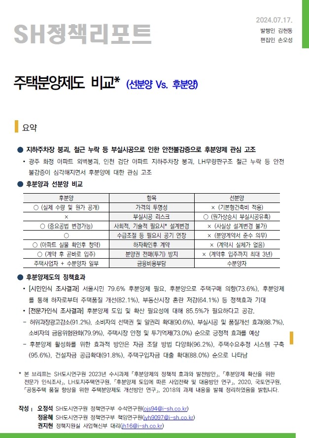 서울주택도시공사(SH공사, 사장 김헌동)가 선분양과 후분양 제도를 비교하고 주택분양제도가 나아갈 방향을 제안하는 정책 리포트를 발간했다.